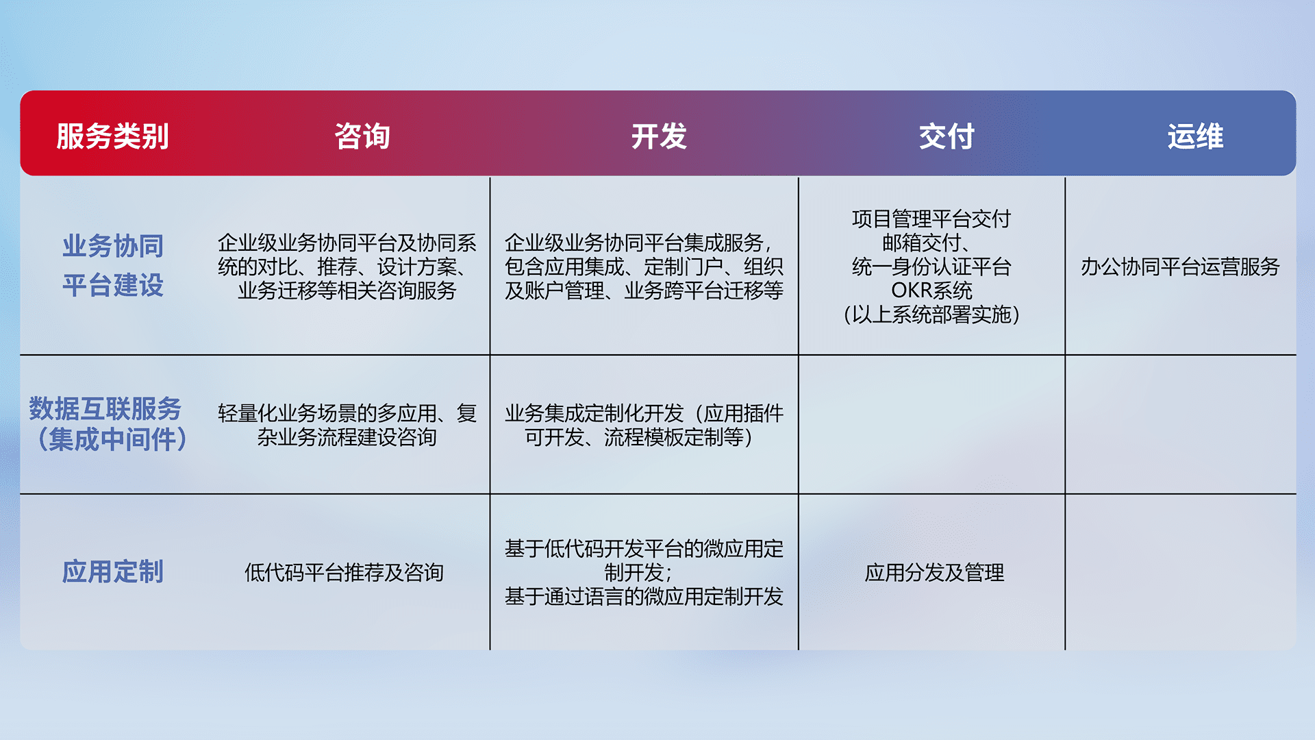 针对钉钉、、、、企微、、IDaas等平台级产品提供产品的规划、、、方案、、、、交付、、、定制化开发等服务,,,实现如统一协同办公、、智能客户服务、、、混合会议管理、、、智能数据查询、、、、等业务场景,,,实现数字化转型。。。。