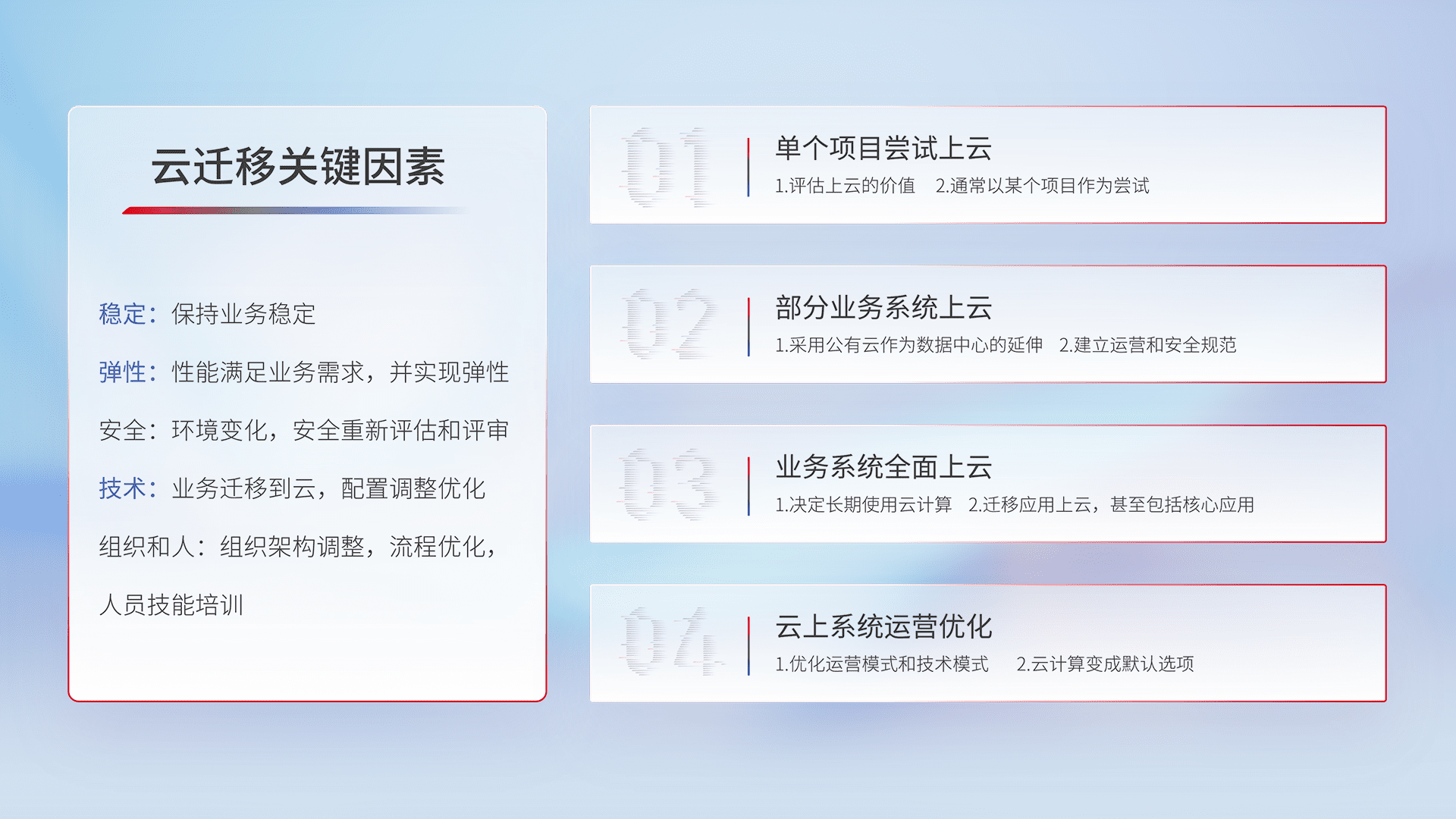 结合实际业务,,从规划设计、、、、云平台选型、、、、云原生改造、、数据迁移、、、集成交付,,迁移全过程为客户识别最佳上云路径,,,,做好风险识别管理,,,设计网络架构、、、、身份权限、、安全审计合规、、操作审计、、、日志审计、、、监控告警策略、、、多站点容灾设计等,,,对云上基础设施进行整体规划,,提升IT治理水平,,以满足弹性、、、高可用、、高性能的需求。。
