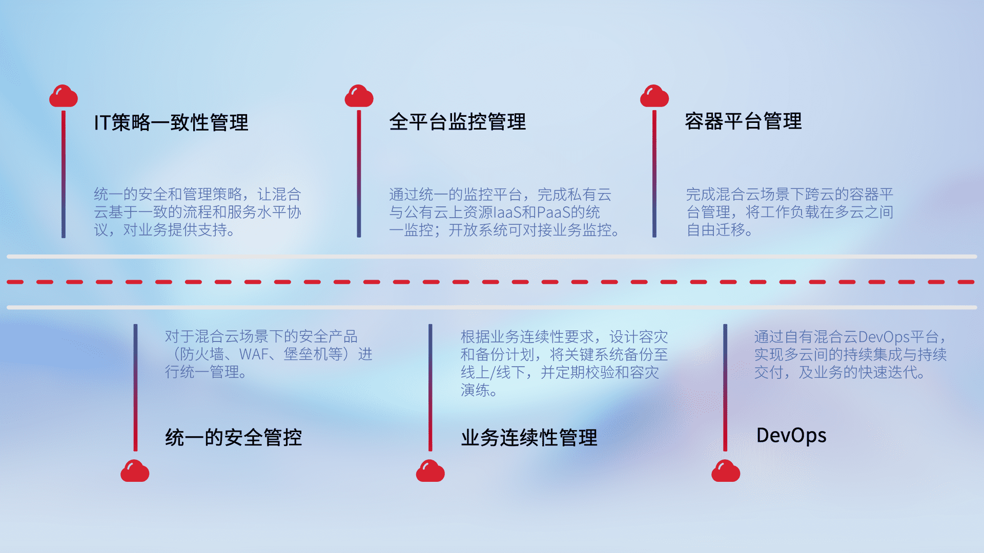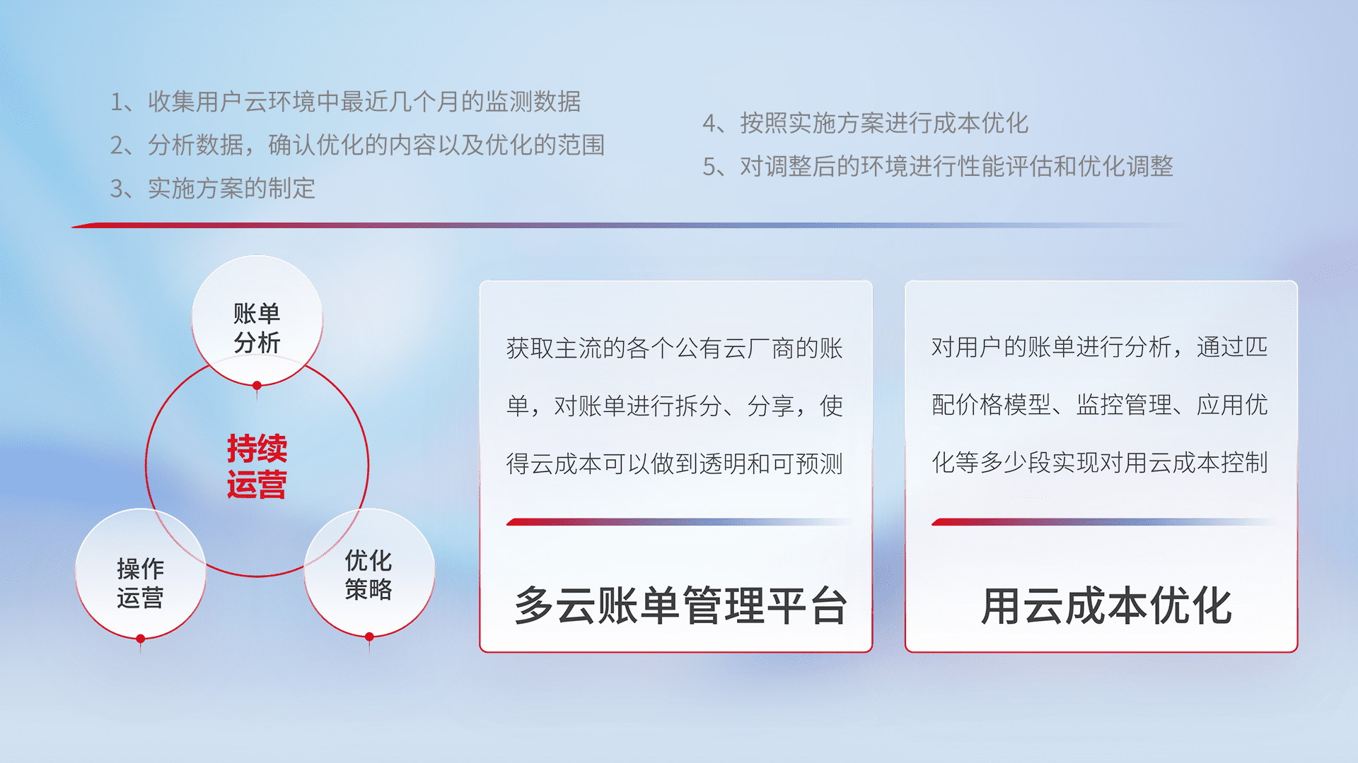 通过多云纳管,,,,以统一的资源数据模型把客户的云资源进行抽象和封装,,,,进而实现对多云资源的统一操作,,,,保障云资源管理的可靠性、、、、稳定性与可用性。。。。量身定制化运维内容,,,配置、、、、开发运维、、、、补丁管理、、、备份、、、监控、、、、认证和访问管理、、审计和日常巡检等,,,,保障在用云过程中的可靠度,,,,稳定度以及高可用率。。